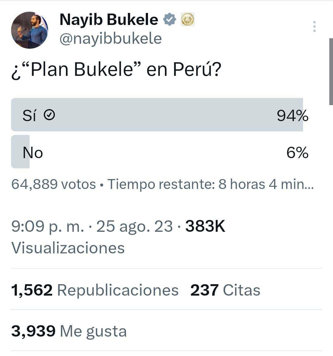 El presidente Nayib Bukele se pronunció, mediante la red social X, sobre el debate entre autoridades peruanas respecto a implementar el ‘Plan Bukele’. Hasta la tarde de este sábado, la encuesta registró un 93.6% de ‘sí’ y, para el ‘no’, solo 6.4%.
