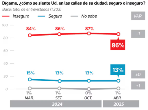 Por otro lado, el 86 % de los encuestados aseguran sentirse inseguros en la ciudad donde viven, lo que agudiza la sensación de vulnerabilidad. Estos niveles de temor afectan tanto la vida cotidiana como las decisiones a futuro de la población.