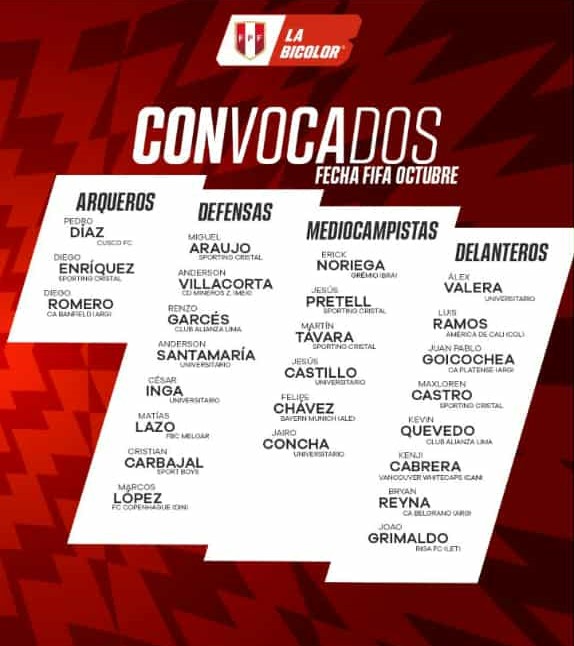 Recordemos que el cotejo ante La Roja será el viernes 10 de octubre a las 6:00 pm. (hora peruana) en el Estadio Bicentenario de La Florida, en Santiago. Los entrenamientos de La Bicolor serán a partir del 06 de octubre en La Videna FPF, mientras que el viaje a Chile está pactado para el jueves 9 en horas de la tarde.