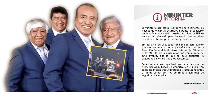 “Cabe señalar que este evento privado no contaba con las garantías emitidas por la Dirección General de Gobierno Interior del Mininter, ni la PNP de dicha jurisdicción fue comunicada de este evento, por lo que se dejó expuesta la seguridad de los artistas y los asistentes”, indicó la cartera.