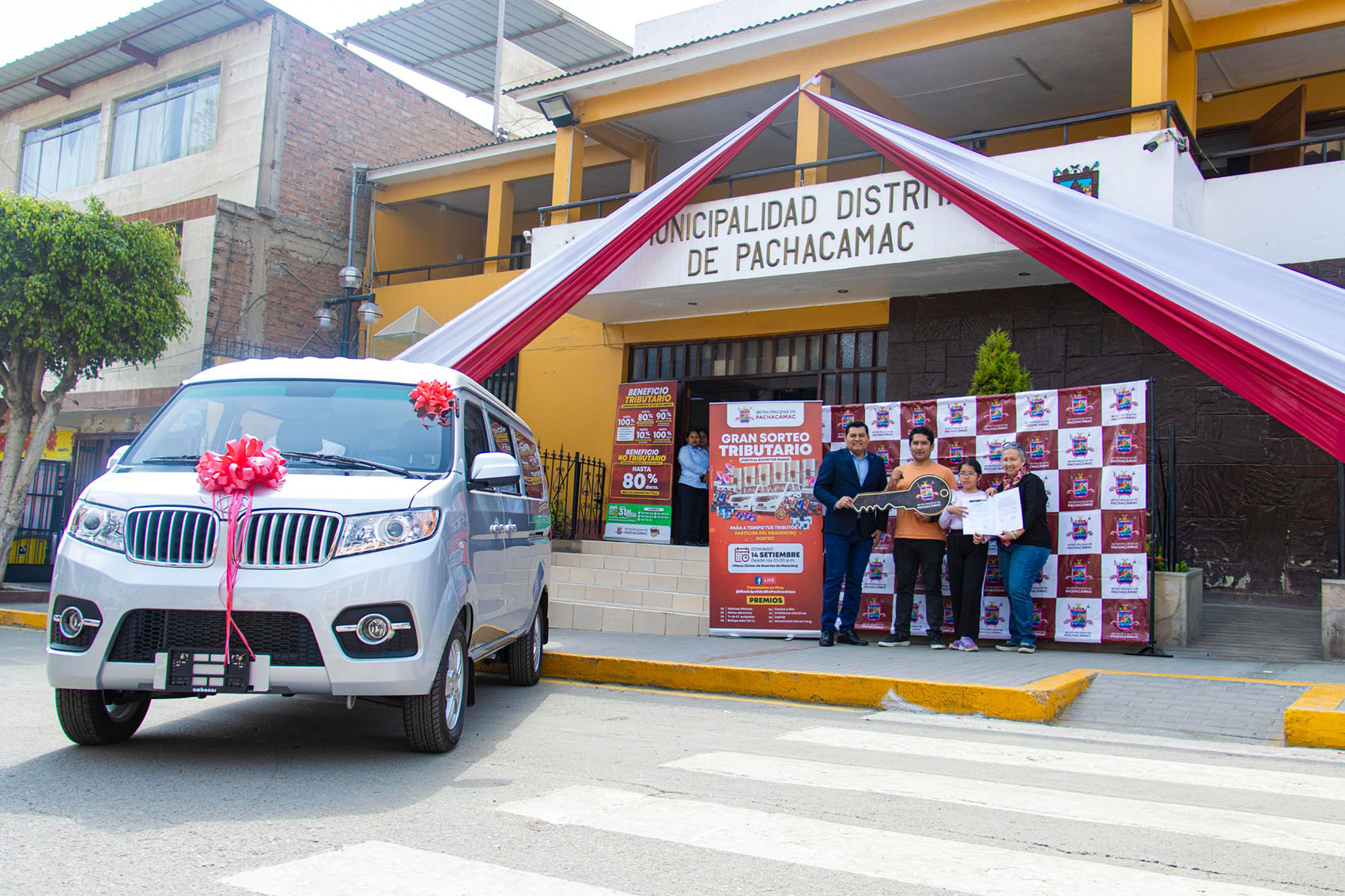 Como una forma de fomentar una cultura tributaria responsable y contribuir con el desarrollo de su distrito, la Municipalidad de Pachacámac realizó un sorteo de diversos artículos entre sus vecinos, quienes están al día en el pago de sus tributos hasta agosto de este año, entregando el día de ayer una minivan a un afortunado ganador.