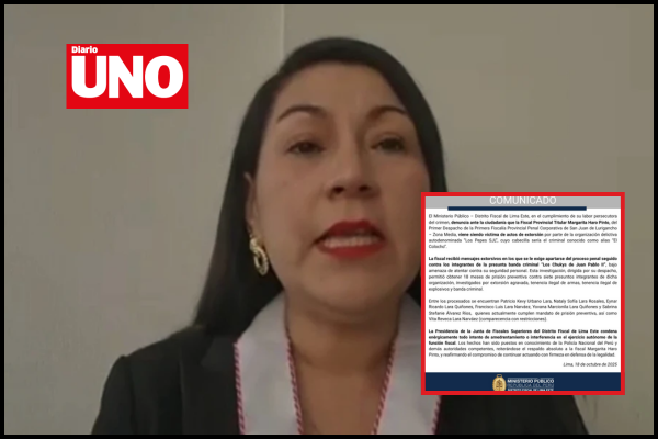 La fiscal provincial Margarita Haro Pinto recibió amenazas de la organización criminal ‘Los Pepes SJL’ por su trabajo en la investigación contra la banda ‘Los Chukys de Juan Pablo II’. El presunto líder de esta organización, conocido como ‘El Colocho’, le envió mensajes extorsivos el 17 de octubre exigiéndole retirarse del proceso penal.