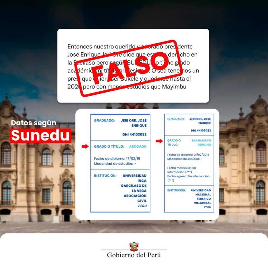 La publicación oficial, etiquetada con el hashtag #NoticiaFalsa, advierte: «¡Atención! Esta información, publicada en redes sociales, es falsa. El presidente José Jerí Oré cuenta con grado académico de bachiller y título de abogado, según registra la Sunedu».