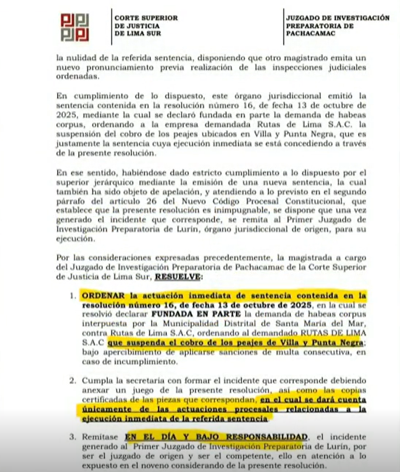 El Poder Judicial ordenó a Rutas de Lima suspender de inmediato el cobro de peajes en las casetas de Villa y Punta Negra. La medida incluye el apercibimiento de aplicar multas consecutivas si la concesionaria no cumple la orden. Esta decisión llega después de que la empresa reiniciara el cobro en el tramo sur de la Panamericana, argumentando que la apelación de una sentencia suspende sus efectos hasta que se resuelva definitivamente.
