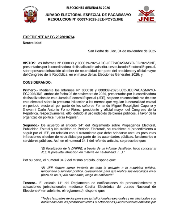 El Jurado Electoral Especial de Pacasmayo emitió un informe donde atribuye responsabilidad funcional a Rospigliosi por no cautelar el uso correcto de los equipos institucionales. El documento también señala como responsable directo al oficial mayor del Congreso, Giovanni Forno. El servidor involucrado habría incurrido en el presunto delito de peculado de uso.