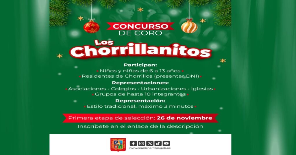 La Municipalidad de Chorrillos invita a todos los niños y niñas del distrito, entre 6 y 13 años, a participar en el Concurso de Coro Navideños “Los Chorrillanitos”, un evento creado para promover las expresiones musicales y tradicionales de nuestro distrito.