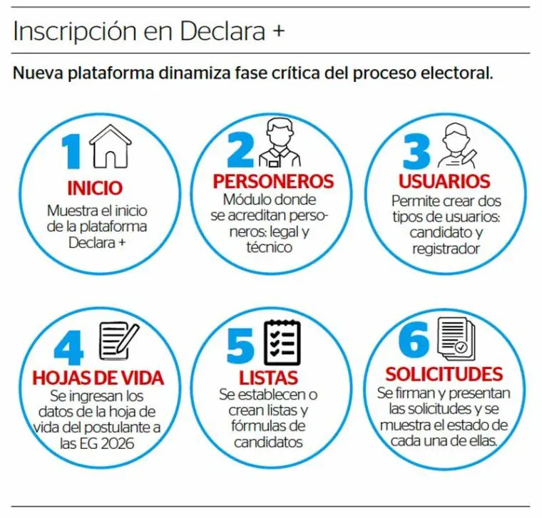 El Jurado Nacional de Elecciones presentó Declara+, su nueva plataforma para inscribir candidaturas a las Elecciones Generales 2026. El sistema unifica tres herramientas anteriores y está diseñado para procesar más de 10,000 postulaciones con mayor capacidad tecnológica y seguridad. Los personeros legales pueden prellenar hojas de vida desde el 10 de noviembre. El JNE advierte que las organizaciones políticas deben verificar que sus candidatos cumplan requisitos legales antes de postularlos.