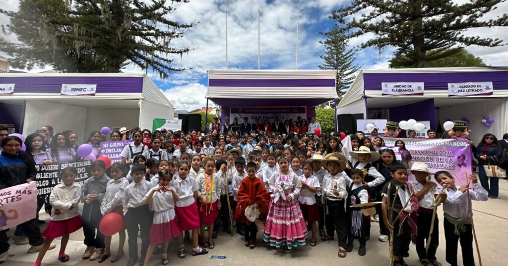La plaza principal de la provincia de San Marcos se convirtió hoy en un punto de encuentro comunitario con la puesta en marcha de la Feria Llapanchipaq Justicia – Por la No Violencia a la Mujer, una importante iniciativa del Poder Judicial que busca acercar servicios, promover prevención y reafirmar el compromiso institucional en la lucha frontal contra la violencia hacia las mujeres.