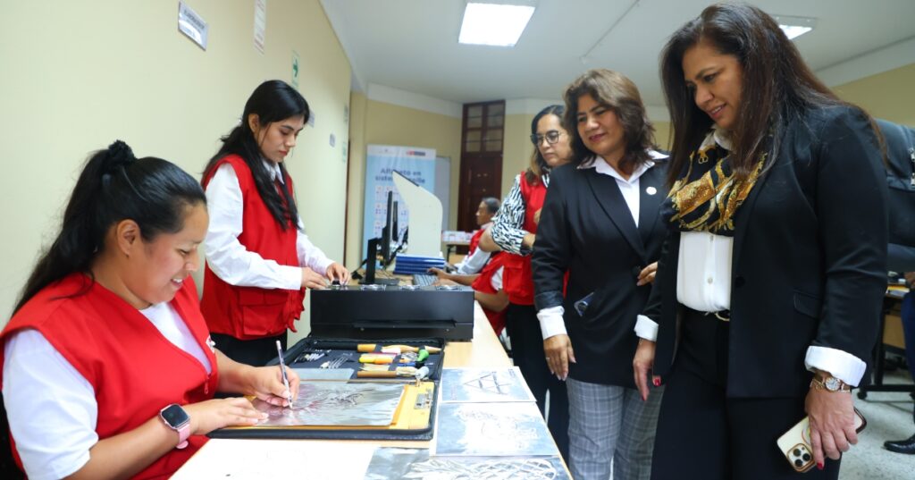La viceministra Cecilia García recorrió las estaciones de producción braille del CENAREBE, donde verificó cómo se adaptan los textos escolares mediante el software EBRAI, la impresión en braille y la elaboración de imágenes en relieve utilizando hornos fuser, matrices de aluminio y equipos Thermoform.