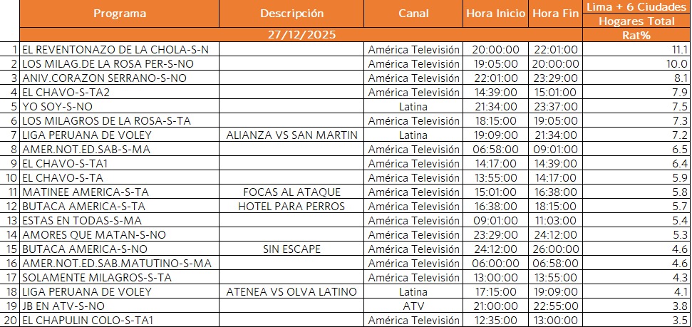El Reventonazo de la Chola cierra el año como el programa más visto del fin de semana, pues este último sábado alcanzó los 11.1 puntos de rating; superando ampliamente a la competencia. Además, la conductora se alista para celebrar la llegada del 2026 con la mejor fiesta junto a La Bella Luz y Son del Duke, este 31 de diciembre en la Explanada de Plaza Norte, en Independencia.