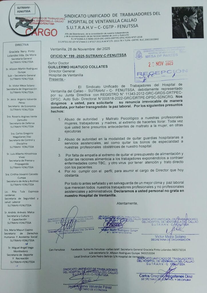 El sindicato de trabajadores del Hospital de Ventanilla ha demando la renuncia o destitución del director Huatuco, a quien responsabilizan por negligencia en el cargo: no cumplir, rehusar o retardar las funciones (grave o muy grave si hay perjuicio al estado); incumplimiento del código de ética: actos contrarios al respeto, probidad y eficiencia en la atención a pacientes.