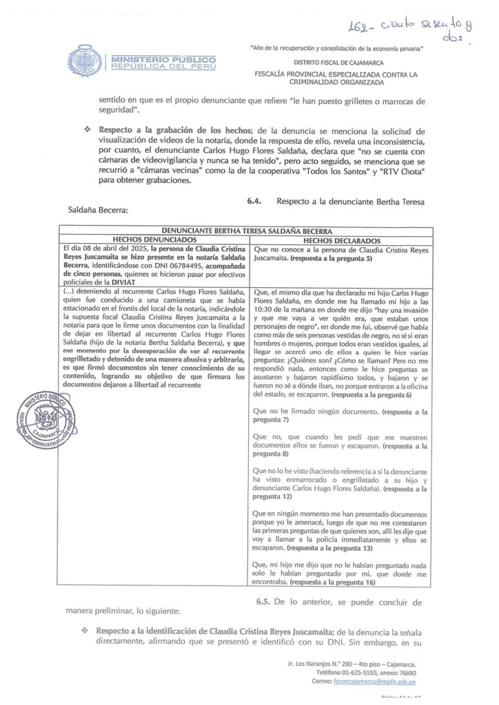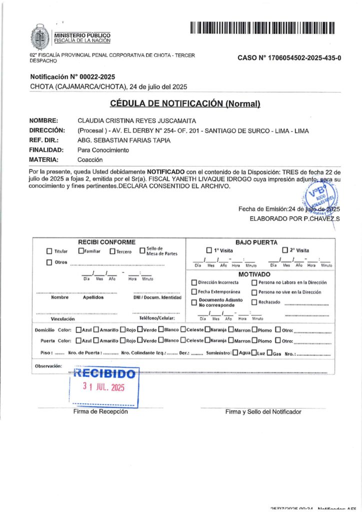 Sobre ello, la abogada Claudia Reyes Juscamaita ha remitido las pruebas que acreditan que las declaraciones efectuadas por la Notaria de Chota sobre su persona fueron falsas, y además ha remitido el archivo del proceso penal conjuntamente con el cargo de remisión al pruebas al propio OSCE. Sobre el caso relacionado a un proceso sancionador, ha remitido la resolución y documentos que acreditan que el OSCE se encuentra en el proceso de fiscalización respectivo.