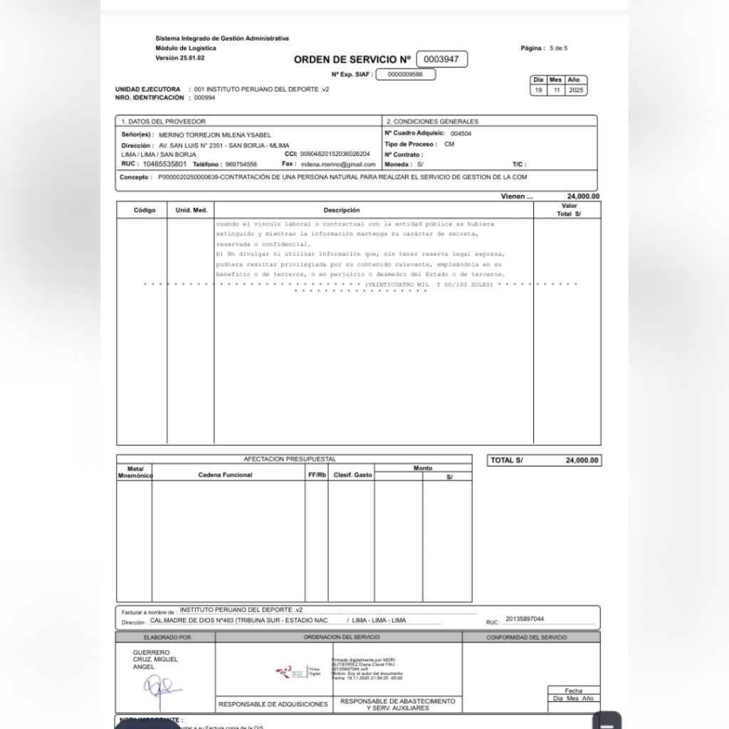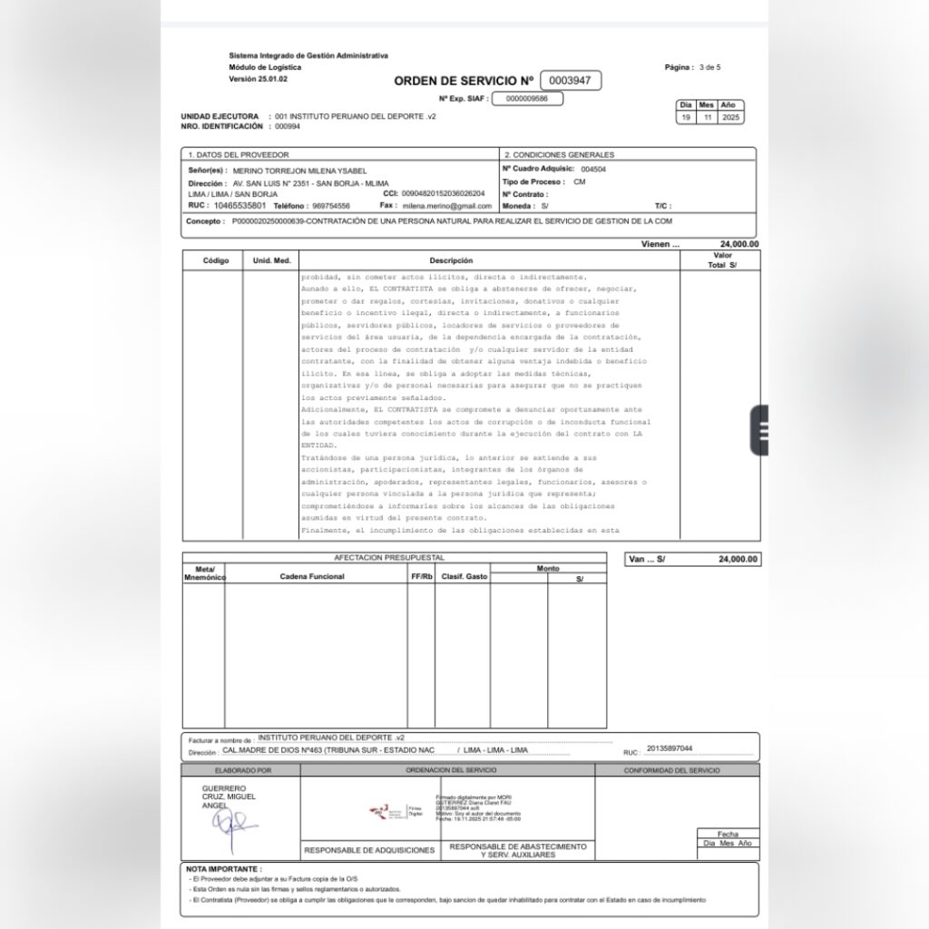 La periodista – quien tiene el grado de bachiller – se hizo de una orden de servicio de S/ 24,000 soles por laborar apenas 40 días, bajo el concepto de «gestión de comunicación institucional». El monto equivale a 18,000 soles al mes, cifra que supera el sueldo de los directores que cuentan con títulos, ámplia experiencia en la gestión pública y especializaciones avanzadas. Quien solicita esta orden es, nada menos que la propia presidencia, es decir el mismo Sergio Ludeña.