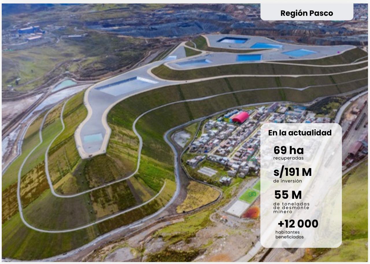 La intervención permitió la recuperación de más de 69 hectáreas afectadas por actividad minera histórica, así como la estabilización y el aislamiento de aproximadamente 55 millones de toneladas de desmonte minero que permanecieron acumuladas por más de seis décadas, constituyéndose en uno de los procesos de remediación más relevantes ejecutados en la zona centro del país.