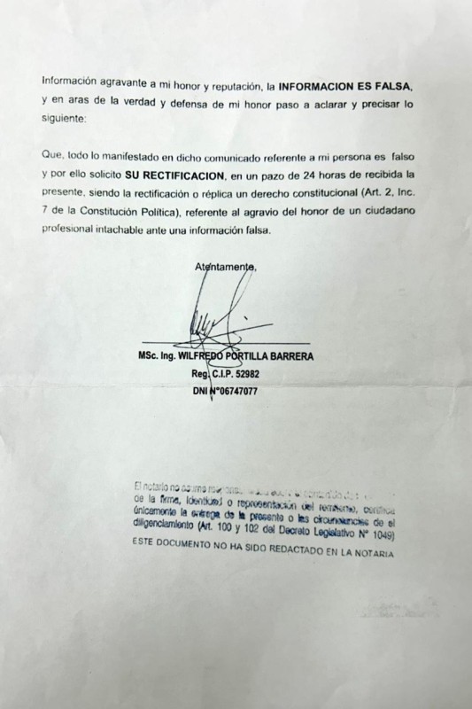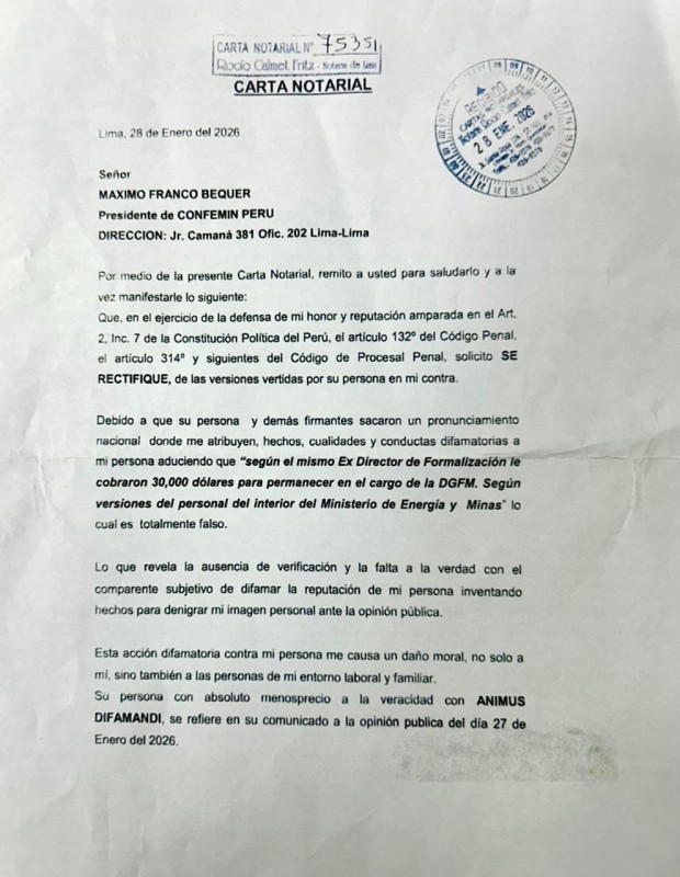 A través de una carta notarial, Portilla Barrera sostiene que las afirmaciones que lo vinculan con pagos irregulares son falsas y difamatorias, y solicita que se rectifiquen en un plazo máximo de 24 horas. En el documento, dirigido a Máximo Franco Béquer, presidente de CONFEMIN Perú, advierte que se le atribuyen hechos y conductas que nunca ocurrieron, lo que constituye un intento de dañar su imagen personal y profesional.