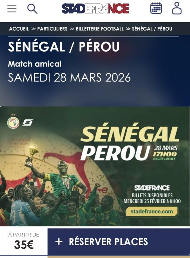 Se inició ayer miércoles el proceso de venta de localidades para el partido amistoso entre las selecciones de Senegal y Perú el próximo 28 de marzo en la página oficial del Stade de France de París, que será en horario peruano a las 11:00 de la mañana, en el debut del técnico brasileño Mano Menezes al frente de la “Blanquirroja”