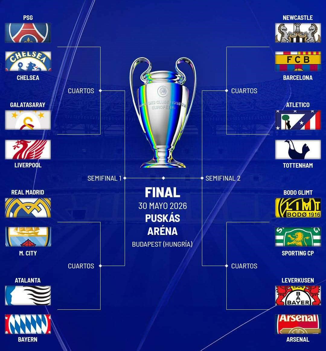 PSG (FRA)-Chelsea (ING); Galatasaray (TUR)-Liverpool (ING); Real Madrid (ESP)-Manchester City (ING); Atalanta (ITA)-Bayern Múnich (ALE); Newcastle (ING)-F.C. Barcelona (ESP); Atlético de Madrid (ESP)- Tottenham (ING); Bodo Glimt (NOR)-Sporting de Lisboa (POR); Bayer Leverkusen (ALE)-Arsenal (ING).